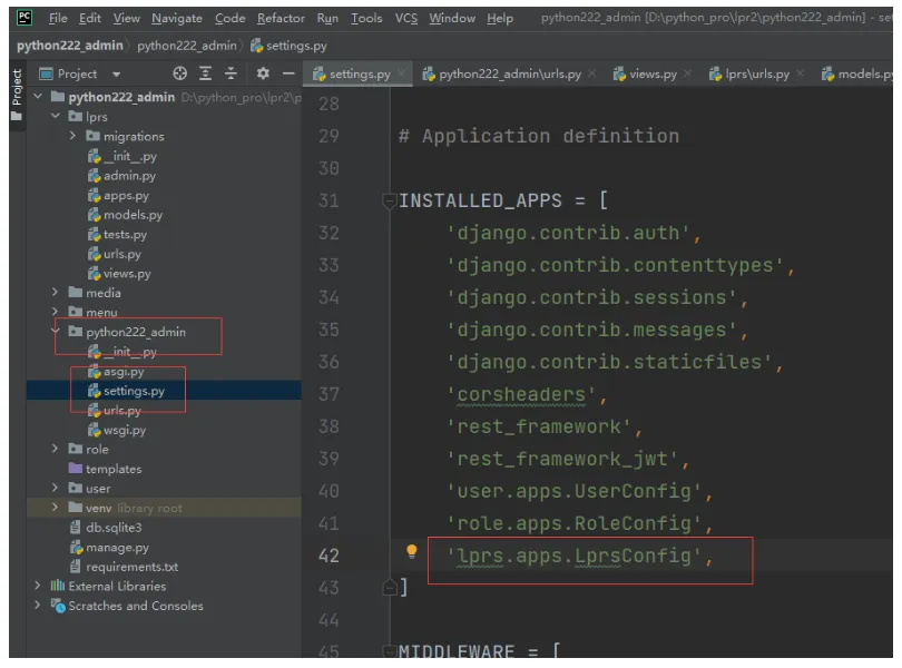 接下来,主项目settings.py里,INSTALLED_APPS 里面加下lprs模块配置
