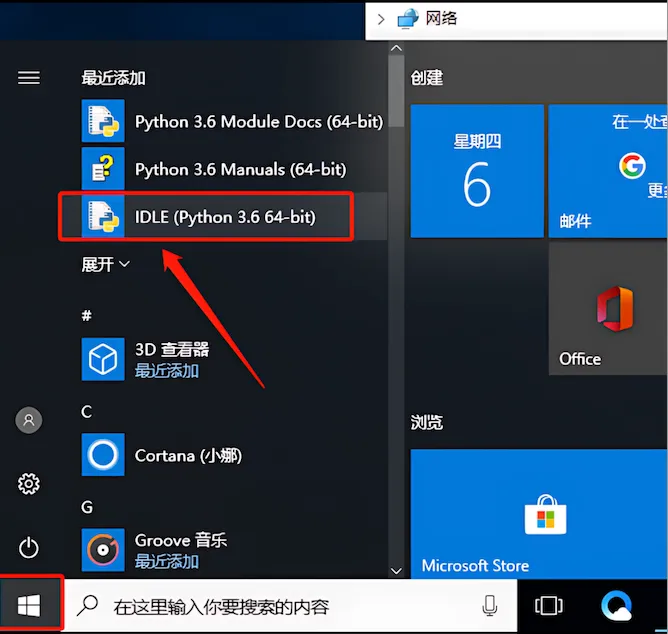 10、在菜单栏选择【IDLE(Python 3.6 64-bit)】打开(直接拖到桌面即可创建桌面快捷方式)。