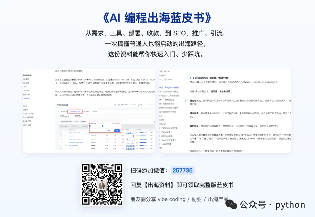 从需求、工具、部署、收款,到 SEO、推广、引流,一步步带你搞懂普通人也能启动的出海路径。这份资料能帮你快速入门、少踩坑。