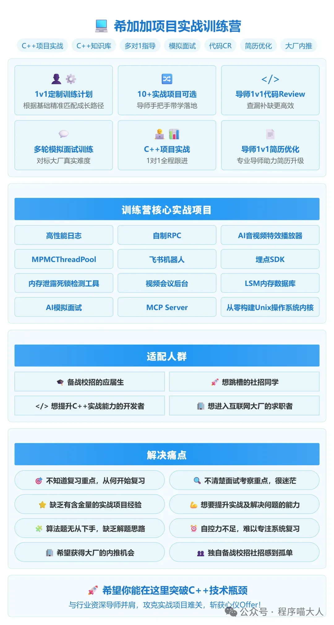 如果你的目标是把技术水平拉起来,也想在简历上增加一些真正能说得出口的内容,可以趁这段时间做几个C++ 实战项目。既能把底层功底练扎实,也能让春招、考研复试、社招面试里遇到的技术问题更从容,有需要的朋友可以移步文末查看训练营相关介绍。