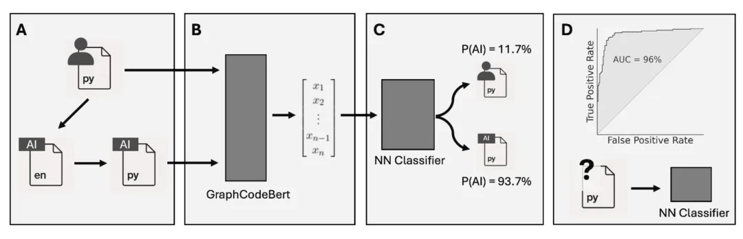 该研究构建的分类器依赖GraphCodeBert提取代码特征。随着生成式AI模型的快速迭代,检测方法需要持续更新。对抗性训练框架可以模拟"检测器-生成器"的军备竞赛,通过生成对抗网络(GAN)让检测器学习识别最难区分的AI代码。元学习方法可以使检测器快速适应新模型:在多个已知模型上预训练后,仅需少量新模型样本即可微调。此外,代码风格的时间漂移是一个挑战——人类编程风格本身也在受AI影响而演变。持续学习(Continual Learning)技术可以在不忘记旧知识的前提下适应新的分布,避免灾难性遗忘。多模态特征融合——结合代码文本、抽象语法树、数据流图、甚至开发者的提交历史——可以提供更鲁棒的检测信号。