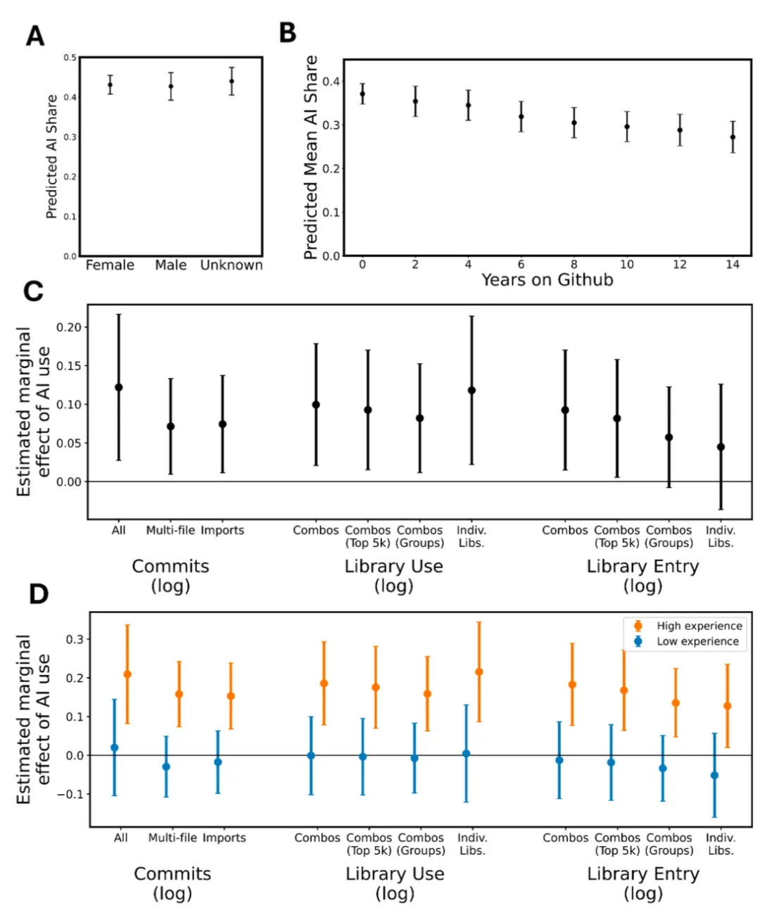 该研究聚焦于代码产出数量(提交次数),但代码质量同样关键。自然语言处理技术可以分析提交信息、代码评审评论、Issue讨论,评估代码的可维护性、可读性和bug倾向。静态分析工具结合机器学习可以预测代码的缺陷密度、技术债务和安全漏洞风险。时间序列分析可以追踪AI采用后项目的长期健康指标:Issue解决速度、PR合并率、贡献者留存率、代码流失率等。知识图谱可以建模开发者的技能演化轨迹,评估AI是否真正帮助新手"升级"还是让他们"跳过"了关键学习阶段,这对理解AI时代的人才培养至关重要。