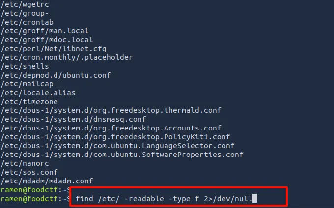要查找目录中所有可读文件: 从特定目录中查找所有可读文件。在下面的截图中,我们正在发现 /etc 目录下所有可读形式的文件。