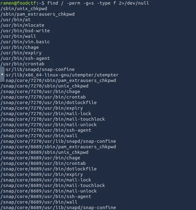 查找 SGID 文件: SGID 权限与 SUID 类似,但唯一的区别是,每当任何设置了 SGID 权限的命令运行时,该进程将拥有与文件所有者相同的组所有权。因此,要运行所有具有 SGID 位的文件,请输入命令: