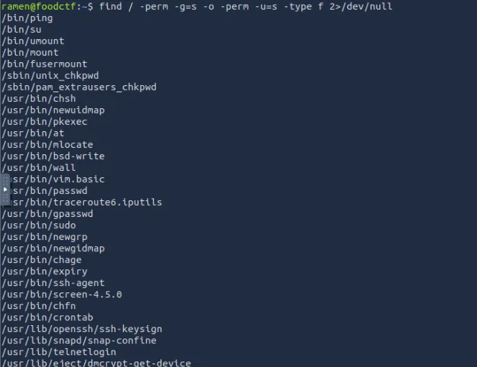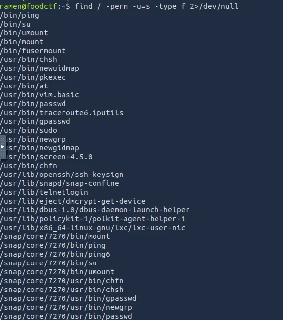 众所周知,我们已经获得了受害者机器的访问权限,因此我们将使用 Find 命令来识别具有 SUID 权限的二进制文件。