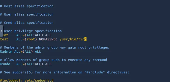 test ALL=(root) NOPASSWD: /usr/bin/find