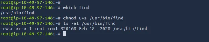 which findchmod u+s /usr/bin/findls -la /usr/bin/find