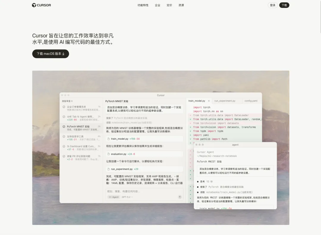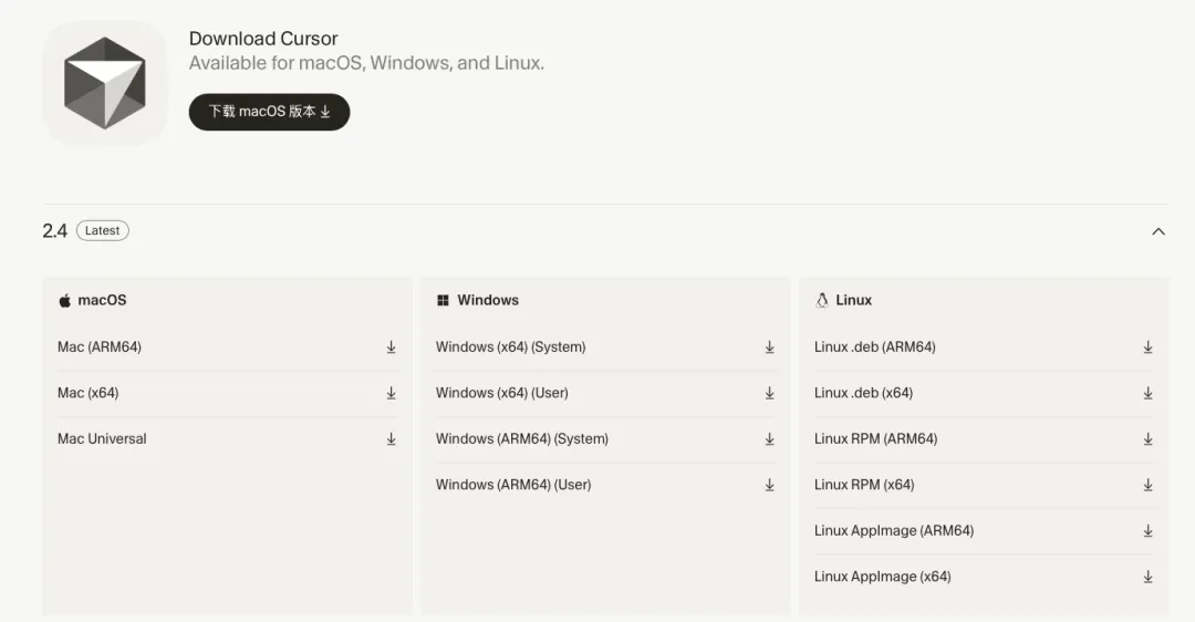 首先,你必须有一台电脑;Cursor虽然支持了移动/网页的Agent交流和代码编写,但是实际使用还是以电脑为主;打开浏览器进入Cursor官网,右上角找到下载按钮,根据自己的电脑情况选择Windows或者mac,完成安装(跟你安装其他软件没有任何区别);