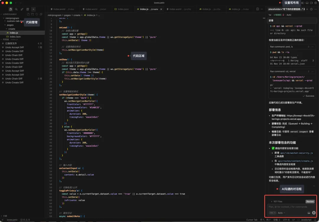 这里的输入框,就是用来跟AI聊天的,AI在聊天过程中,也会有一些意见会咨询你,及时查看并且确认就行;开发应用的过程非常丝滑,一个不懂代码的普通人,唯一需要做的就是看一下AI的建议,然后不断的点接受。