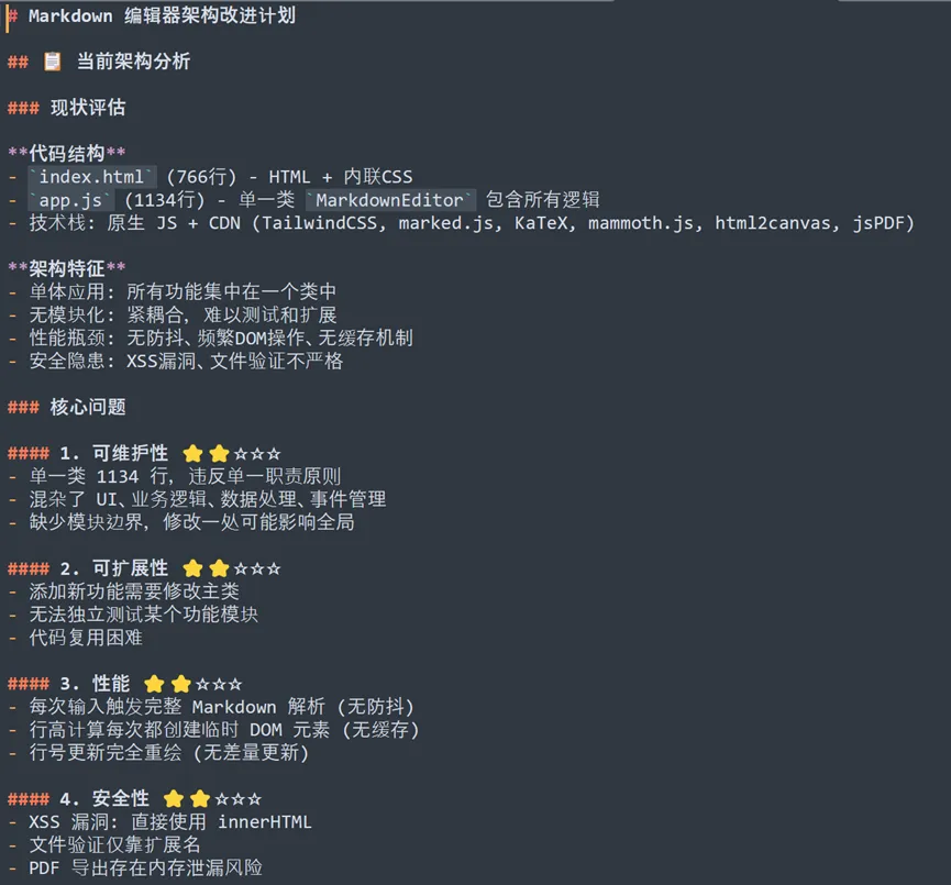 防抖、可扩展性、安全性的说明让我第一次知道了我自己多么无知。作为一个软件产品经理,我才深知我对软件的了解非常有限。通过Trae实现的软件,如果没有特殊要求,一般都是非常简单的单文件或者脚本,也是通过这个项目我第一次知道前端模块化。于是我便使用Claude Code的计划模式,与大模型讨论了第一版重构方案。
