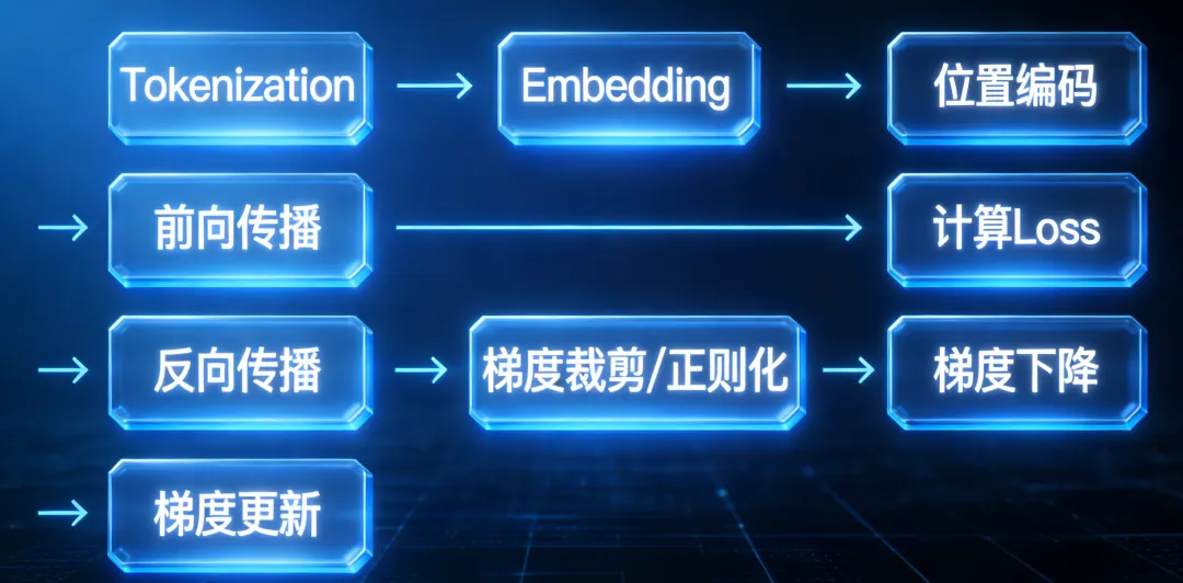 Tokenization(词元化) →Positional Encoding(位置编码)-> Embedding(Token向量化) → Forward Propagation(前向传播) → 计算 Loss (损失函数值)→ 反向传播(计算梯度) → 梯度裁剪 / 正则化 → 梯度下降(优化器计算更新量) → 梯度更新(更新模型参数)