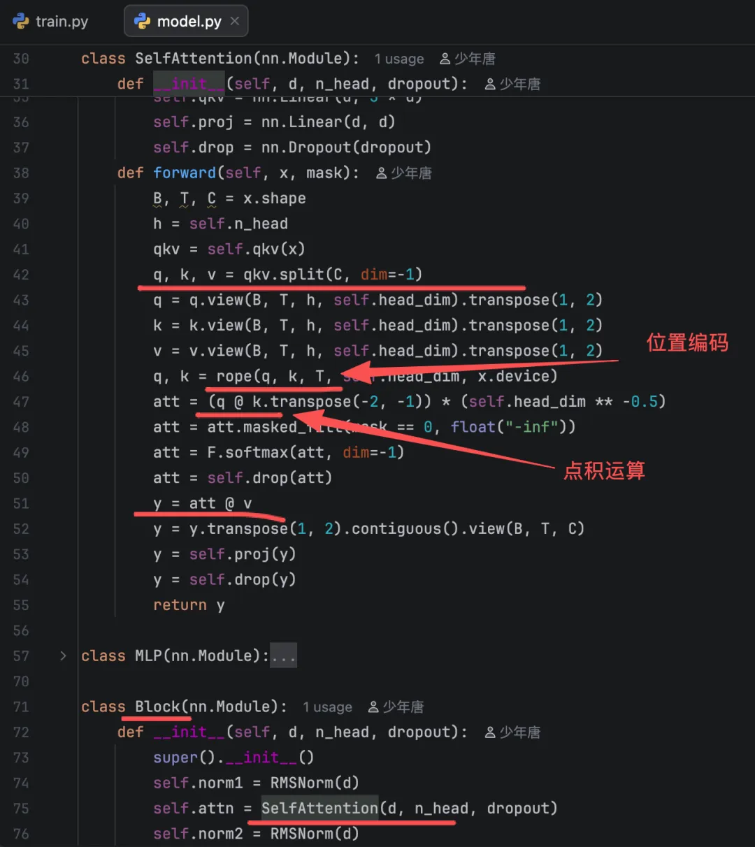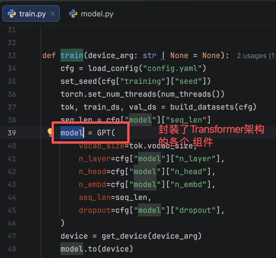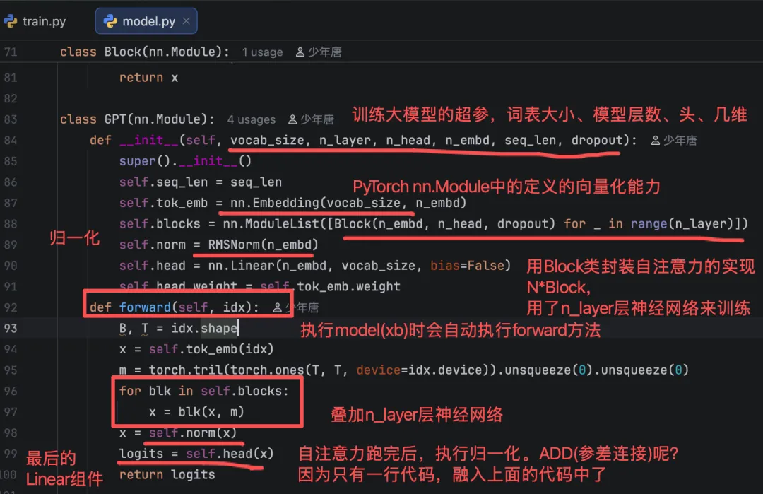 model.py中存放实现Transformer架构中的类、组件。