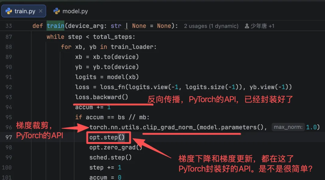 PyTorch框架很强,把大模型的训练过程封装的很好,我们自己写的代码会大量使用nn.Module的API,本次先知道PyTorch的这个API,知道这个API是干什么用的就可以了,后面开个专题来讲一来,本次不展开。
