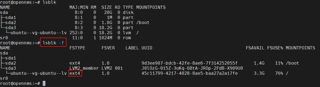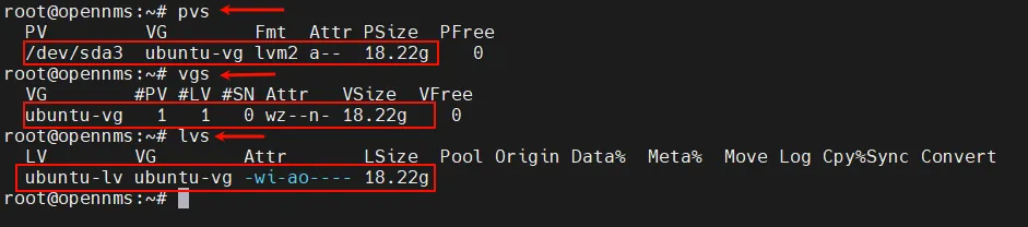 # 查看物理卷、卷组、逻辑卷状态pvs # 物理卷信息vgs # 卷组信息 lvs # 逻辑卷信息# 查看磁盘空间lsblkfdisk -l