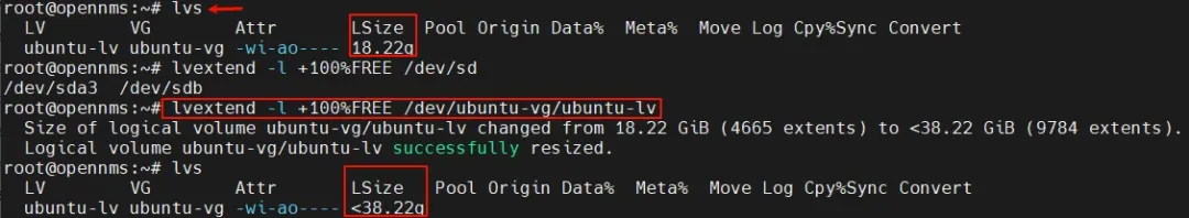 # 查看可用的卷组空间vgs# 扩展逻辑卷(使用所有可用空间)lvextend -l +100%FREE /dev/ubuntu-vg/ubuntu-lv# 或指定具体大小lvextend -L +10G /dev/vg_name/lv_name # 增加10Glvextend -L 50G /dev/vg_name/lv_name # 扩展到50G