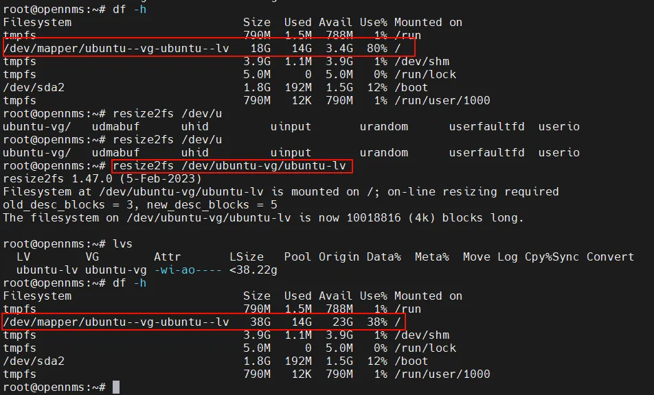 # 在线调整(无需卸载)resize2fs /dev/ubuntu-vg/ubuntu-lv# 如果resize2fs报错,可以先检查文件系统e2fsck -f /dev/ubuntu-vg/ubuntu-lvresize2fs /dev/ubuntu-vg/ubuntu-lv