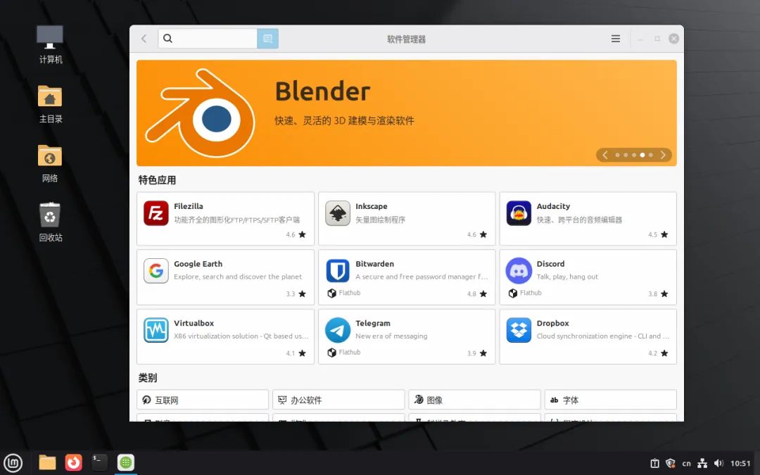 · 默认采用 Cinnamon 桌面环境,布局与 Windows 相似,用户学习成本低。