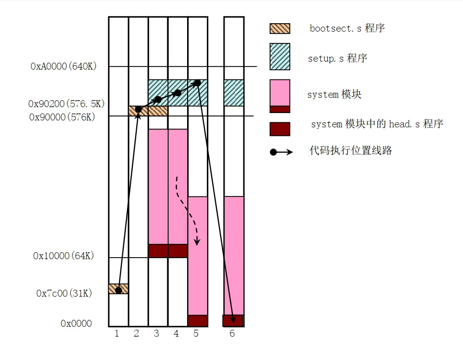 1. bootsect.S 被替换为 xtydaz.hb:xitongyindaoanzhuang.huibian即系统引导安装,汇编引导加载程序 bootsect.S 将 setup.s 代码和 system 模块加载到内存中,并且分别把自己和 setup.s 代码移动到物理内存 0x90000 和 0x90200 处后,就把执行权交给了 setup 程序。其中 system 模块的首部包含有 head.s 代码。bootsect.S 代码是磁盘引导块程序,驻留在磁盘的第一个扇区中(引导扇区, 0 磁道(柱面), 0 磁头,第 1 个扇区)。在 PC 机加电、 ROM BIOS 自检后, ROM BIOS 会把引导扇区代码 bootsect 加载到内存地址 0x7C00 开始处并执行之。在 bootsect 代码执行期间,它会将自己移动到内存绝对地址 0x90000 开始处并继续执行。该程序的主要作用是首先把从磁盘第 2 个扇区开始的 4 个扇区的 setup 模块(由 setup.s 编译而成)加载到内存紧接着 bootsect 后面位置处( 0x90200),然后利用 BIOS 中断 0x13 取磁盘参数表中当前启动引导盘的参数,接着在屏幕上显示“ Loading system...”字符串。再者把磁盘上 setup 模块后面的system 模块加载到内存 0x10000 开始的地方。“在 bootsect 代码执行期间,它会将自己移动到内存绝对地址 0x90000 开始处并继续执行。"应该的意思:"在 bootsect 代码执行期间,它将自己复制一份到内存绝对地址 0x90000 开始处并后跳转继续执行。"原文自己移动会导致理解错误,因为它不是唯一一份的移动而是复制了一份自己A,再跳转到这个A运行,这里原来的位置内存地址 0x7C00后续会被覆盖!2. setup.S 被替换为 xtaz.hb:xitonganzhuang.huibian即系统安装,汇编这里对应的bootsect分身A会被覆盖,当它做完了它该做的事情,它就退场了,留下了工作空间给setup安放其他的数据,一开始的内存地址 0x7C00可能会被system 模块覆盖(system 模块大小大于0x7C00时候).setup 程序的主要作用是利用 ROM BIOS 的中断程序获取机器的一些基本参数,并保存在 0x90000开始的内存块中,供后面程序使用。同时把 system 模块往下移动到物理地址 0x00000 开始处,这样, system中的 head.s 代码就处在 0x00000 开始处了。然后加载描述符表基地址到描述符表寄存器中,为进行 32位保护模式下的运行作好准备。接下来对中断控制硬件进行重新设置,最后通过设置机器控制寄存器 CR0并跳转到 system 模块的 head.s 代码开始处,使 CPU 进入 32 位保护模式下运行。3. head.s 被替换为 xttcsh.hb:xitongtouchushihua.huibian即系统头初始化.汇编在 0x90000开始的ROM BIOS 的中断程序获取机器的一些基本参数因为system大小小于0x90000不会被覆盖!当然setup更不会被覆盖.Head.s 代码的主要作用是初步初始化中断描述符表中的 256 项门描述符,检查 A20 地址线是否已经打开,测试系统是否含有数学协处理器。然后初始化内存页目录表,为内存的分页管理作好准备工作。最后跳转到 system 模块中的初始化程序 init/main.c 中继续执行。4. 以上的前两个xtydaz.hb和xttcsh.hb格式不一致, 后续两种编译器需要修改以实现汉意化,最终能够编译这三个汇编代码, 然后可以实现对引导安装的功能!