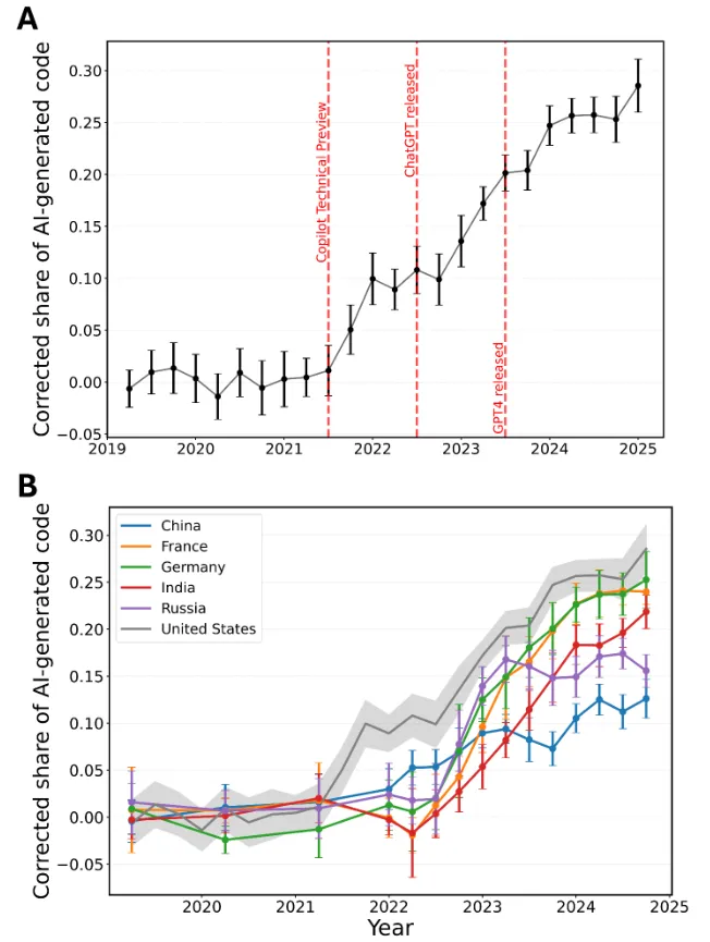 截至2024年底,美国开发者提交的Python函数中,已有约29%被算法判定为AI生成。
