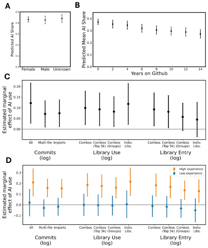 文章最引人深思的发现在于AI对不同经验水平开发者的不对称影响。