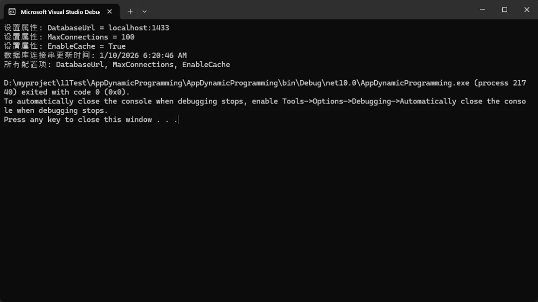 using System.Dynamic;using System.Net.Http.Json;using System.Text.Json;using System.Text.Json.Serialization;namespaceAppDynamicProgramming{internalclassProgram {staticvoidMain(string[] args) {dynamic config = new SmartConfig();// 动态设置属性 config.DatabaseUrl = "localhost:1433"; config.MaxConnections = 100; config.EnableCache = true;// 动态调用方法var updateTime = config.GetUpdateTime("DatabaseUrl");var allProps = config.GetAllProperties(); Console.WriteLine($"数据库连接串更新时间: {updateTime}"); Console.WriteLine($"所有配置项: {string.Join(", ", allProps)}"); } }publicclassSmartConfig : DynamicObject {private Dictionary<string, object> _properties = new Dictionary<string, object>();private Dictionary<string, DateTime> _updateTimes = new Dictionary<string, DateTime>();// 重写获取成员的行为publicoverrideboolTryGetMember(GetMemberBinder binder, outobject result) {string propertyName = binder.Name;// 添加日志记录 Console.WriteLine($"访问属性: {propertyName}");return _properties.TryGetValue(propertyName, out result); }// 重写设置成员的行为publicoverrideboolTrySetMember(SetMemberBinder binder, objectvalue) {string propertyName = binder.Name;// 自动记录更新时间 _updateTimes[propertyName] = DateTime.Now; _properties[propertyName] = value; Console.WriteLine($"设置属性: {propertyName} = {value}");returntrue; }// 自定义方法调用publicoverrideboolTryInvokeMember(InvokeMemberBinder binder, object[] args, outobject result) { result = null;switch (binder.Name) {case"GetUpdateTime":if (args.Length == 1 && args[0] isstring propName) { result = _updateTimes.TryGetValue(propName, out DateTime time) ? time : (DateTime?)null;returntrue; }break;case"GetAllProperties": result = _properties.Keys.ToList();returntrue; }returnfalse; } }}