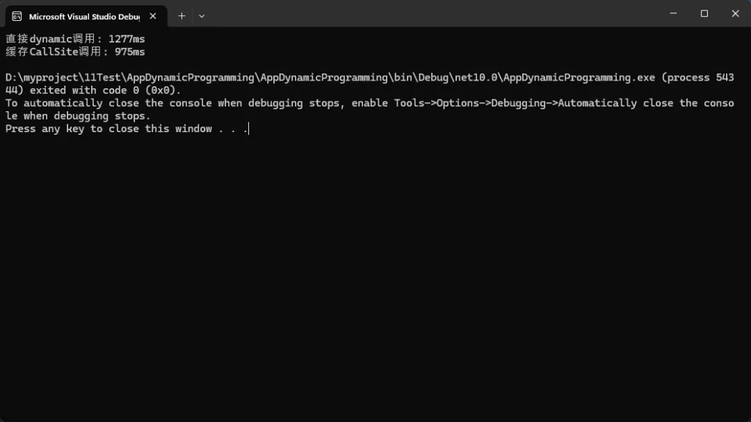 publicclassPerformanceOptimizedDynamic{// 缓存CallSite以提高性能privatestaticreadonly ConcurrentDictionary<string, CallSite<Func<CallSite, object, object>>> GetMemberSites = new ConcurrentDictionary<string, CallSite<Func<CallSite, object, object>>>();privatestaticreadonly ConcurrentDictionary<string, CallSite<Func<CallSite, object, object, object>>> SetMemberSites = new ConcurrentDictionary<string, CallSite<Func<CallSite, object, object, object>>>();publicstaticobjectGetMember(object target, string memberName) {var site = GetMemberSites.GetOrAdd(memberName, name => CallSite<Func<CallSite, object, object>>.Create( Binder.GetMember(CSharpBinderFlags.None, name, typeof(PerformanceOptimizedDynamic), new[] { CSharpArgumentInfo.Create(CSharpArgumentInfoFlags.None, null) }) ) );return site.Target(site, target); }publicstaticvoidSetMember(object target, string memberName, objectvalue) {var site = SetMemberSites.GetOrAdd(memberName, name => CallSite<Func<CallSite, object, object, object>>.Create( Binder.SetMember(CSharpBinderFlags.None, name, typeof(PerformanceOptimizedDynamic),new[] { CSharpArgumentInfo.Create(CSharpArgumentInfoFlags.None, null), CSharpArgumentInfo.Create(CSharpArgumentInfoFlags.None, null) }) ) ); site.Target(site, target, value); }// 性能测试对比publicstaticvoidPerformanceTest() {var obj = new ExpandoObject();dynamic dynamicObj = obj;// 预热for (int i = 0; i < 1000; i++) { dynamicObj.TestProperty = i;varvalue = dynamicObj.TestProperty; }// 测试直接dynamic调用var sw1 = Stopwatch.StartNew();for (int i = 0; i < 100000; i++) { dynamicObj.TestProperty = i;varvalue = dynamicObj.TestProperty; } sw1.Stop();// 测试缓存CallSite调用var sw2 = Stopwatch.StartNew();for (int i = 0; i < 100000; i++) { SetMember(obj, "TestProperty", i);varvalue = GetMember(obj, "TestProperty"); } sw2.Stop(); Console.WriteLine($"直接dynamic调用: {sw1.ElapsedMilliseconds}ms"); Console.WriteLine($"缓存CallSite调用: {sw2.ElapsedMilliseconds}ms"); }}按一惯逻辑,写一缓存肯定效率上去,实际上dynamic每个调用点生成CallSite,效率更快。