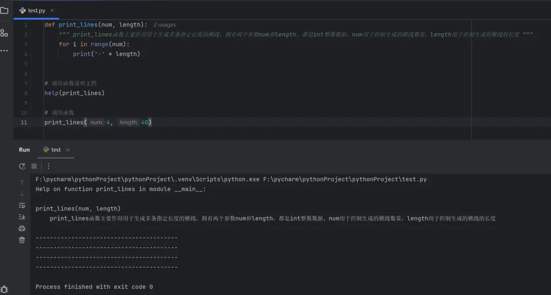 def print_lines(num, length): """ print_lines函数主要作用用于生成多条指定长度的横线,拥有两个参数num和length,都是int整数数据,num用于控制生成的横线数量,length用于控制生成的横线的长度 """ for i in range(num): print('-' * length)# 调用函数说明文档help(print_lines)# 调用函数print_lines(4, 40)