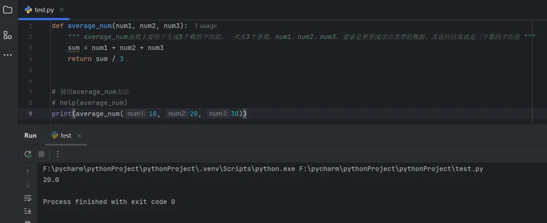 def average_num(num1, num2, num3): """ average_num函数主要用于生成3个数的平均值,一共有3个参数,num1、num2、num3,要求是整型或浮点类型的数据,其返回结果就是三个数的平均值 """ sum = num1 + num2 + num3 return sum/3# 调用average_num方法# help(average_num)print(average_num(10, 20, 30))