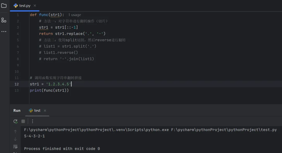 def func(str1): # 方法一:对字符串进行翻转操作(切片) str1 = str1[::-1]return str1.replace('.', '-') # 方法二:使用split切割,然后reverse进行翻转 # list1 = str1.split('.') # list1.reverse()# return '-'.join(list1)# 调用函数实现字符串翻转拼接str1 = '1.2.3.4.5'print(func(str1))