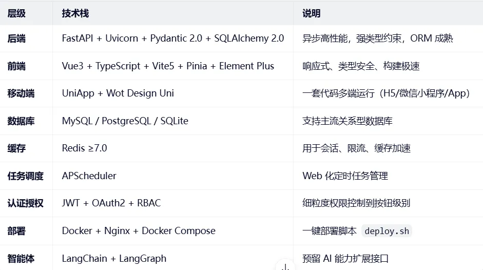 FastapiAdmin 的技术选型堪称“前沿且务实”的典范: