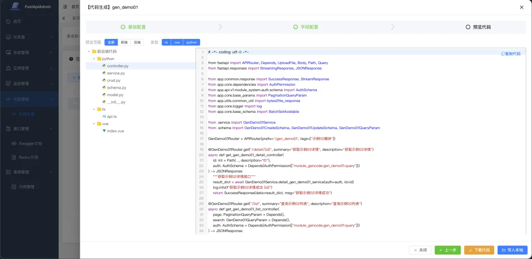对比优势:市面上多数代码生成工具仅输出后端或前端代码,而 FastapiAdmin 实现了全栈同步生成,且遵循统一的工程规范,生成的代码可直接用于生产环境。