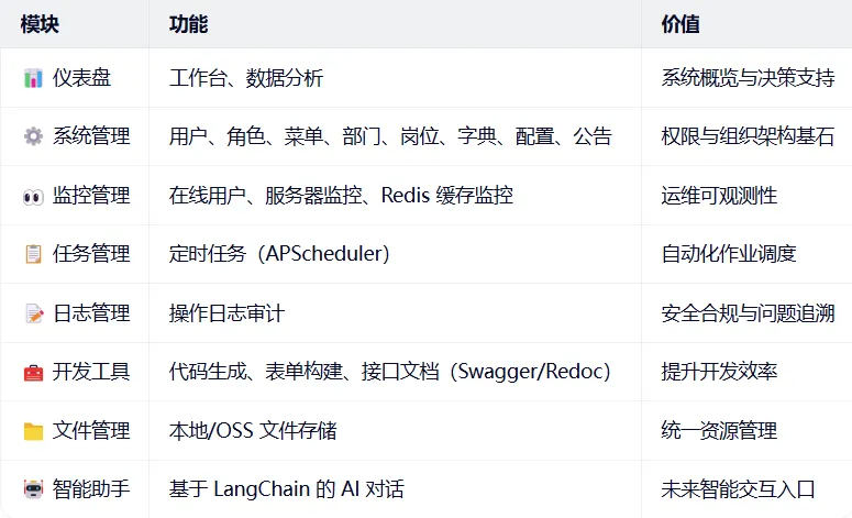 FastapiAdmin 内置了八大核心功能模块,覆盖企业后台 90% 的通用需求: