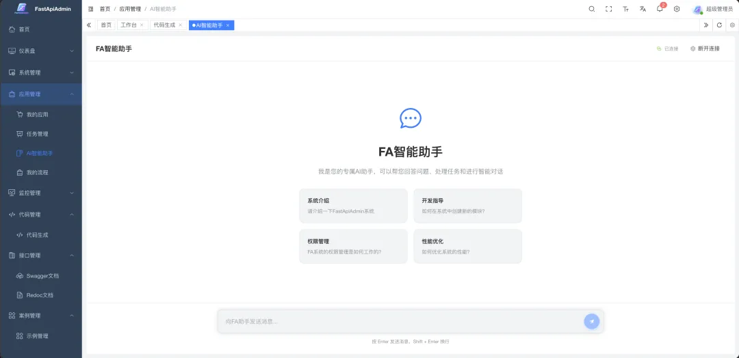 在软件工程领域,“重复造轮子”一直是效率的最大敌人。用户管理、角色权限、操作日志、文件上传、定时任务……这些看似基础的功能,却耗费了无数开发团队宝贵的时间与精力。当业界还在争论“低代码是否可靠”时,一个名为 FastapiAdmin 的开源项目悄然崛起——它不仅提供了开箱即用的企业级后台,更以插件化架构 + 全栈代码生成 + AI 智能体集成的组合拳,重新定义了中后台系统的构建方式。