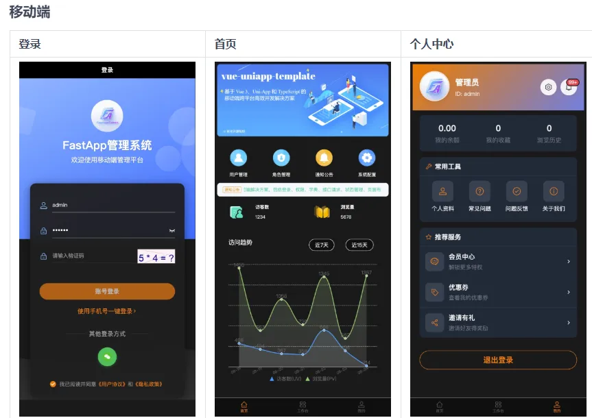 FastapiAdmin 不仅提供 Web 后台(Vue3 + Element Plus),还通过 FastApp 项目(基于 UniApp)实现了移动端适配。