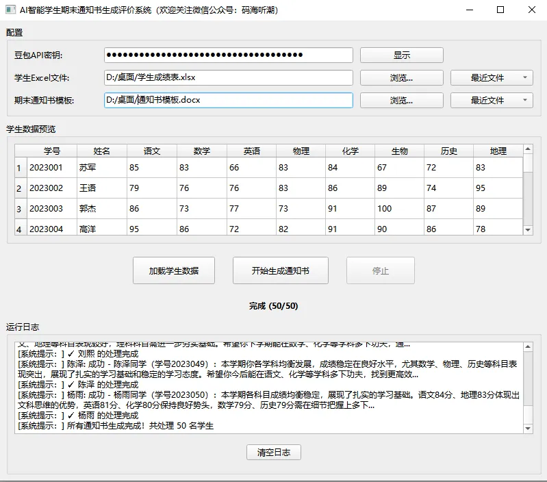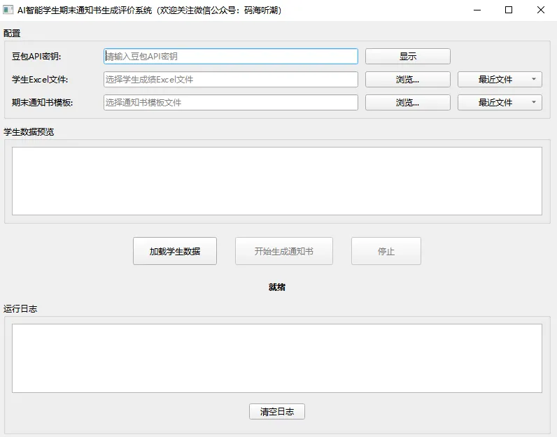 import sysfrom PyQt6.QtWidgets import *from PyQt6.QtCore import *from PyQt6.QtGui import *class MainWindow(QMainWindow): def __init__(self): super().__init__() self.setup_ui() def setup_ui(self): """设置界面""" self.setWindowTitle("AI智能学生期末通知书生成评价系统(欢迎关注微信公众号:码海听潮)") self.setGeometry(100, 100, 800, 600) # 设置中心窗口部件 central_widget = QWidget() self.setCentralWidget(central_widget) main_layout = QVBoxLayout(central_widget) main_layout.setSpacing(10) # 顶部配置区域 config_group = QGroupBox("配置") config_layout = QGridLayout() config_layout.setSpacing(10) # API密钥输入 config_layout.addWidget(QLabel("豆包API密钥:"), 0, 0) self.api_key_input = QLineEdit() self.api_key_input.setEchoMode(QLineEdit.EchoMode.Password) self.api_key_input.setPlaceholderText("请输入豆包API密钥") config_layout.addWidget(self.api_key_input, 0, 1, 1, 3) # 显示/隐藏密码按钮 self.show_password_btn = QPushButton("显示") self.show_password_btn.setCheckable(True) self.show_password_btn.clicked.connect(self.toggle_password_visibility) config_layout.addWidget(self.show_password_btn, 0, 4) # 文件选择 - Excel文件 config_layout.addWidget(QLabel("学生Excel文件:"), 1, 0) self.excel_path_input = QLineEdit() self.excel_path_input.setPlaceholderText("选择学生成绩Excel文件") config_layout.addWidget(self.excel_path_input, 1, 1, 1, 3) self.browse_excel_btn = QPushButton("浏览...") self.browse_excel_btn.clicked.connect(self.browse_excel_file) config_layout.addWidget(self.browse_excel_btn, 1, 4) # 最近Excel文件下拉菜单 self.recent_excel_menu = QMenu(self) self.recent_excel_btn = QPushButton("最近文件") self.recent_excel_btn.setMenu(self.recent_excel_menu) config_layout.addWidget(self.recent_excel_btn, 1, 5) # 文件选择 - 模板文件 config_layout.addWidget(QLabel("期末通知书模板:"), 2, 0) self.template_path_input = QLineEdit() self.template_path_input.setPlaceholderText("选择通知书模板文件") config_layout.addWidget(self.template_path_input, 2, 1, 1, 3) self.browse_template_btn = QPushButton("浏览...") self.browse_template_btn.clicked.connect(self.browse_template_file) config_layout.addWidget(self.browse_template_btn, 2, 4) # 最近模板文件下拉菜单 self.recent_template_menu = QMenu(self) self.recent_template_btn = QPushButton("最近文件") self.recent_template_btn.setMenu(self.recent_template_menu) config_layout.addWidget(self.recent_template_btn, 2, 5) config_group.setLayout(config_layout) main_layout.addWidget(config_group) # 学生数据预览区域 data_group = QGroupBox("学生数据预览") data_layout = QVBoxLayout() self.student_table = QTableWidget() # 初始时不设置列数,加载数据时动态设置 self.student_table.setColumnCount(0) self.student_table.horizontalHeader().setSectionResizeMode(QHeaderView.ResizeMode.Stretch) data_layout.addWidget(self.student_table) data_group.setLayout(data_layout) main_layout.addWidget(data_group) # 控制按钮区域 - 居中显示 control_frame = QFrame() control_layout = QHBoxLayout(control_frame) control_layout.setAlignment(Qt.AlignmentFlag.AlignCenter) # 加载学生按钮 self.load_students_btn = QPushButton("加载学生数据") self.load_students_btn.setFixedSize(120, 40) self.load_students_btn.clicked.connect(self.load_students) control_layout.addWidget(self.load_students_btn) # 添加间距 control_layout.addSpacing(20) # 开始生成按钮 self.generate_btn = QPushButton("开始生成通知书") self.generate_btn.setFixedSize(140, 40) self.generate_btn.clicked.connect(self.start_generation) self.generate_btn.setEnabled(False) control_layout.addWidget(self.generate_btn) # 添加间距 control_layout.addSpacing(20) # 停止按钮 self.stop_btn = QPushButton("停止") self.stop_btn.setFixedSize(100, 40) self.stop_btn.clicked.connect(self.stop_generation) self.stop_btn.setEnabled(False) control_layout.addWidget(self.stop_btn) main_layout.addWidget(control_frame) # 状态信息标签 self.status_label = QLabel("就绪") self.status_label.setAlignment(Qt.AlignmentFlag.AlignCenter) self.status_label.setStyleSheet("QLabel { padding: 5px; font-weight: bold; }") main_layout.addWidget(self.status_label) # 日志输出区域 log_group = QGroupBox("运行日志") log_layout = QVBoxLayout() self.log_text = QTextEdit() self.log_text.setReadOnly(True) log_layout.addWidget(self.log_text) # 清空日志按钮 - 修改为居中显示 clear_log_frame = QFrame() clear_log_layout = QHBoxLayout(clear_log_frame) clear_log_layout.setAlignment(Qt.AlignmentFlag.AlignCenter) clear_log_btn = QPushButton("清空日志") clear_log_btn.clicked.connect(self.clear_log) clear_log_layout.addWidget(clear_log_btn) log_layout.addWidget(clear_log_frame) log_group.setLayout(log_layout) main_layout.addWidget(log_group) # 连接API密钥输入变化事件 self.api_key_input.textChanged.connect(self.update_generate_button_state) self.template_path_input.textChanged.connect(self.update_generate_button_state) def toggle_password_visibility(self): """切换密码显示/隐藏""" if self.show_password_btn.isChecked(): self.api_key_input.setEchoMode(QLineEdit.EchoMode.Normal) self.show_password_btn.setText("隐藏") else: self.api_key_input.setEchoMode(QLineEdit.EchoMode.Password) self.show_password_btn.setText("显示") def browse_excel_file(self): """浏览Excel文件""" file_path, _ = QFileDialog.getOpenFileName( self, "选择学生成绩Excel文件", "", "Excel文件 (*.xlsx *.xls)" ) if file_path: self.excel_path_input.setText(file_path) def browse_template_file(self): """浏览模板文件""" file_path, _ = QFileDialog.getOpenFileName( self, "选择通知书模板", "", "Word文档 (*.docx *.doc)" ) if file_path: self.template_path_input.setText(file_path) def update_generate_button_state(self): """更新生成按钮状态""" has_api_key = bool(self.api_key_input.text().strip()) has_template = bool(self.template_path_input.text().strip()) self.generate_