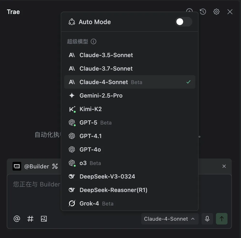 写了一篇 Trae 编程工具的入门介绍后,有很多同学想学 AI 编程,想入门的。Trae 分为国内版本、国际版本,两个版本面向的用户群体不同。国内版本以国内大模型比如 豆包、DeepSeek、千问等等为基础;国际版本以 GPT、Claude、Google Gemini 等等为基础。国内版本网站:https://www.trae.com.cn/国际版本网站:https://www.trae.ai正式写之前,首先更正一个之前表达不正确的说法,Trae 右下角默认不用大家选择大模型了,但我们可以选择关闭。出现大模型选择界面,我们选择 Claude-4-Sonnet如果你已经开始使用 Trae 写一些小工具、小项目、小测试用例等等,对 Trae 有了初步的印象,接下来的分享,应该更容易理解了。1、MCP:简单理解是一个插件,有的专门上网浏览读取资料,有的画图厉害等等,可以从 MCP 市场里面添加,添加后就可用,也可以自己配置。有了 MCP后,Trae 可以和很多软件平台信息进行联通。比如高德、设计软件 Figma 等等。2、智能体:简单可以理解这个是 MCP 的组合版本,Trae 还有内置的,把多个任务串在一起,组成一个智能体,特点是流程标准化。普通人能用用好 AI 编程,加上 MCP、智能体,可以覆盖绝大部分场景了。毫无疑问的是 AI 编程这个垂直领域,是大模型率先攻克的垂直赛道。关注下方公众号,回复关键字:1 ,获取手把手 AI 教程。