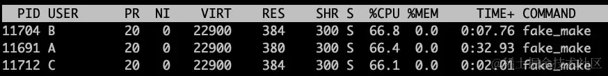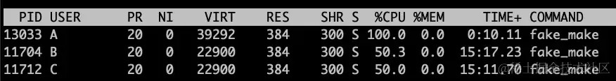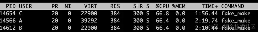 [A@c4]$ ./fake_make -j4job num:4[B@c4]$ ./fake_make -j2job num:2[C@c4]$ ./fake_make -j2job num:2这时查看 CPU 占用的结果如下: