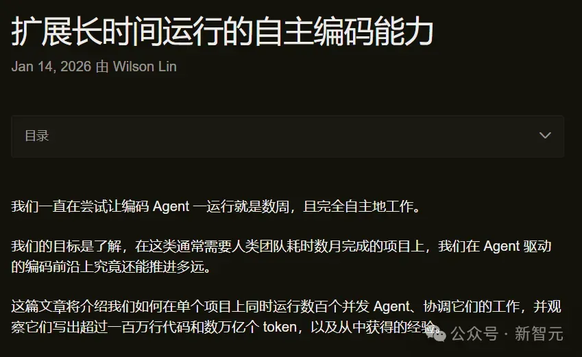 在1月14日,他们发布了一篇题为「Scaling long-running autonomous coding」的博文。