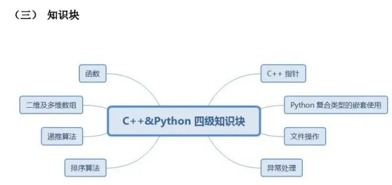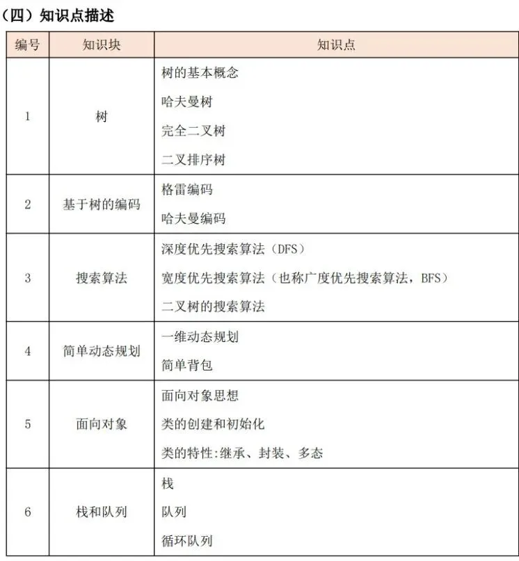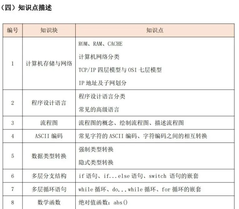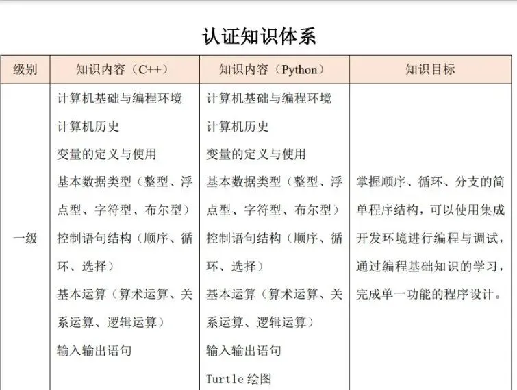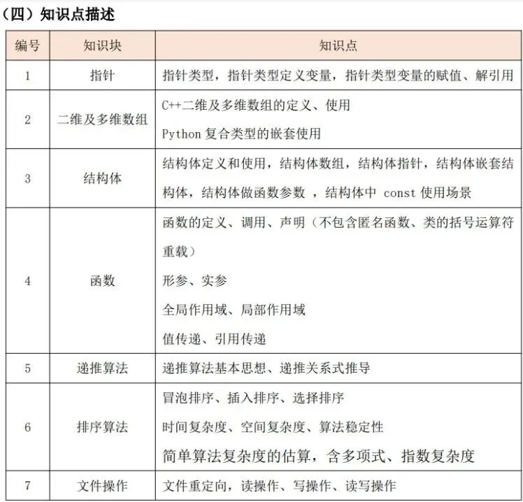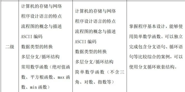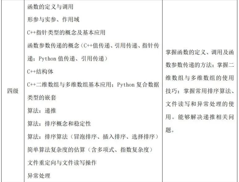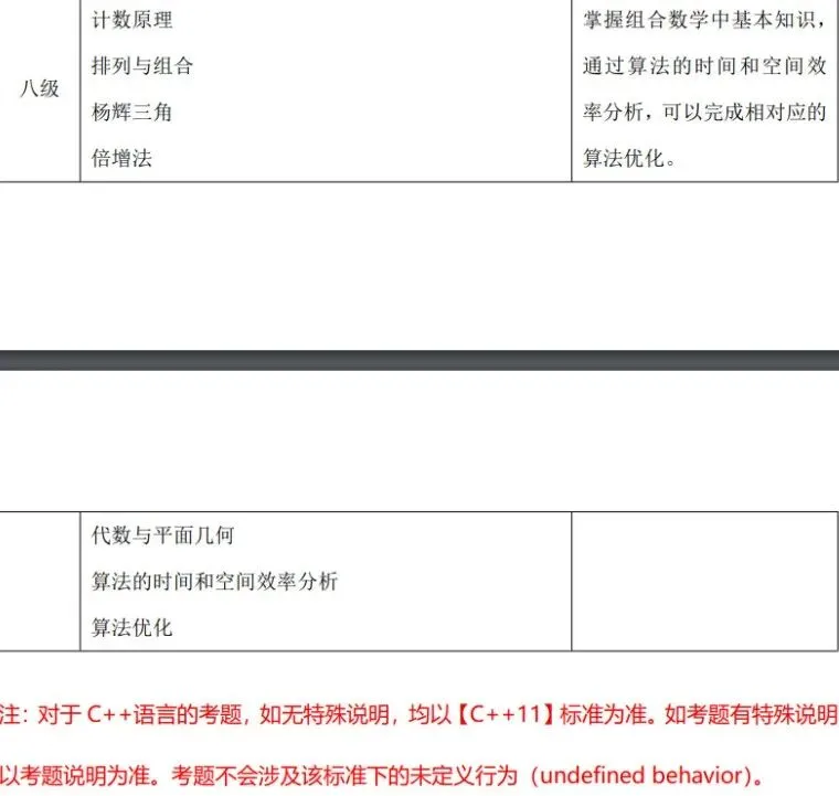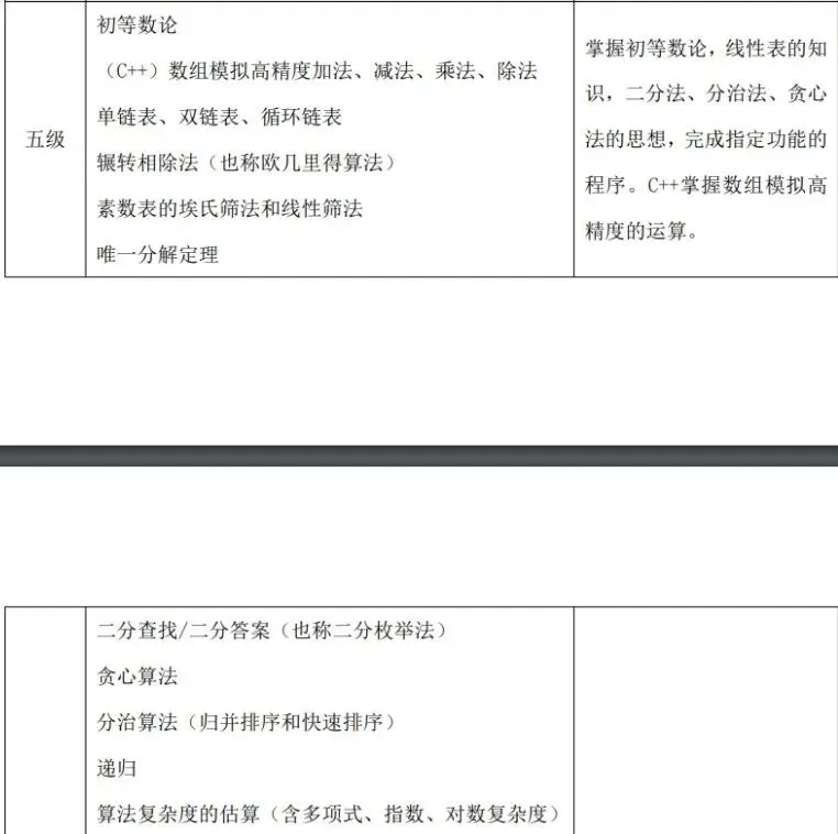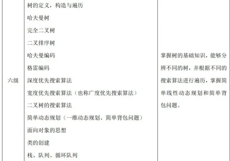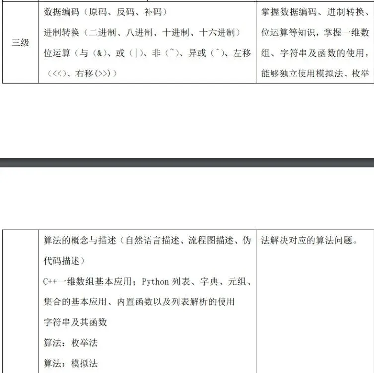 (1)了解计算机存储的基本概念及分类,了解随机存储器(RAM)、只读存储器(ROM)和高速缓冲存储器(Cache)的功能及区别。 (2)了解计算机网络的概念,了解计算机网络的分类(广域网(WAN)、城域网(MAN)、局域网(LAN)),了解计算机网络的层级结构及作用(TCP/IP 四层模型与OSI 七层模型),了解不同层级的重要协议,了解 IP 地址及子网划分。(3)了解程序设计语言的几大分类及特点(机器语言、汇编语言、高级语言),了解常见的高级语言(C++、Python 等)。 (4)了解流程图的概念及基本表示符号,掌握绘制流程图的方法,能正确使用流程图描述程序设计的三种基本结构。 (5)了解编码的基本概念,了解 ASCII 编码原理,能识别常用字符的ASCII码(空格:32、“0”:48、“A”:65、“a”:97),并掌握 ASCII 码和字符之间相互转换的方法。 (6)掌握数据类型的转换:强制类型转换和隐式类型转换。(7)掌握多层分支结构,掌握 if 语句、if...else 语句、switch 语句,及相互嵌套的方法。 (8)掌握多层循环结构,掌握 for 语句、while 语句、do...while 语句,及相互嵌套的方法。 (9)掌握常用的数学函数:绝对值函数、平方根函数、最大值函数、最小值函数、随机数函数理解相应的算法原理。 (二)考核目标 通过计算机基础知识的学习,了解计算机的存储与网络知识、程序设计语言分类及特点、常见的编程语言和绘制流程图的方法。通过 C++知识的学习,掌握数据类型的转换方法及数学库函数的使用,可以独立完成多分支结构与循环结构的程序。 C++&Python 编程三级标准(一)知识点详述 (2)掌握数据的进制转换:二进制、八进制、十进制、十六进制。(3)掌握位运算:与(&)、或(|)、非(~)、异或(^)、左移(<<)、右移(>>)的基本使用方法及原理。 (4)了解算法的概念与描述,熟练运用自然语言、流程图、伪代码方式来描述算法。(5)C++一维数组基本应用(不包括变长数组);Python 列表、字典、元组、集合的基本应用、内置函数以及列表解析的使用. (6)掌握字符串及其函数的使用包括但不限于大小写转换、字符串搜索、分割、替换。 (7)理解枚举算法、模拟算法的原理及特点,可以解决实际问题。(8)理解模拟算法、模拟算法的原理及特点,可以解决实际问题。掌握计算机中常用进位制、位运算及数据编码的知识,掌握一维数组、字符串类型及其函数的使用,掌握枚举法、模拟法的原理和运用技巧,对于较简单的实际问题能构造算法、描述算法、实现算法并调试程序。 【出售告之】CSP-S 《数据结构与算法》课件正式起售……