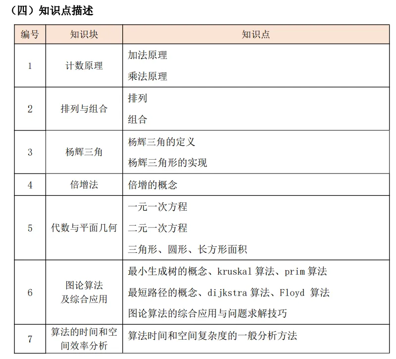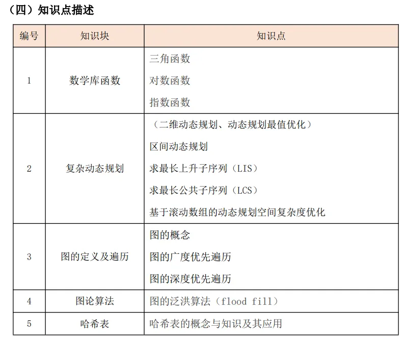 (1)掌握数学库常用函数(三角、对数、指数),三角函数包括sin(x),cos(x)等;对数函数包括 log10(x):返回 x 以 10 为底的对数,log2(x):返回x 以2 为底的对数;指数函数包括 exp(x):计算指数函数,返回 x 的以e 为底的指数函数。(2)掌握复杂动态规划(二维动态规划、动态规划最值优化)。包括区间动态规划、最长上升子序列(LIS)、最长公共子序列(LCS)等内容,理解基于滚动数组等降低动态规划空间复杂度的方法。 (3)图的定义及及基本图论算法。包括图的定义、图的种类(有向图、无向图),图节点的度的概念。掌握编程时图的数据结构表示,以及基于深度优先搜索(DFS)和广度优先搜索(BFS)的图搜索与遍历方法,图的泛洪(flood fill)算法。(4)掌握哈希表的概念与知识及其应用。 (二)考核目标 掌握常用数学库函数,了解相关函数概念与定义。掌握复杂动态规划,包括二维动态规划、求 LIS、LCS 等内容,并掌握利用滚动数组等的优化方法。了解图的定义与广搜和深搜的算法,泛洪算法。了解哈希表的概念和知识。(2)掌握排列与组合基础知识。包括排列、组合的基本概念,及能实现基础排列和组合编程问题的一般方法。 (5)掌握代数与平面几何基础知识(初中数学部分)。包括方程的概念及一元一次方程、二元一次方程的基本求解技巧,求基础平面几何概念、求基本图形(如长方形、三角形、圆形等)的面积等。 (6)掌握图论算法及综合应用技巧。包括最小生成树的概念、kruskal 算法、prim算法,掌握最短路径的概念、单源最短路径的 dijkstra 算法、Floyd 算法等。理解实现同一功能的不同算法的比较,并可以灵活解决相关问题。(7)算法的时间和空间效率分析。能够掌握较为复杂算法的时间和空间复杂度分析方法,能够分析各类算法(包括排序算法、查找算法、树和图的遍历算法、搜索算法、分治及动态规划算法等)的时间和空间复杂度。 (8)算法优化。理解不同方法求解一个问题在时间复杂度和空间复杂度上的差异,理解使用数学知识辅助求解问题的技巧(如可以用循环求出等差数列的和,也可以用数学公式求出等差数列的和),掌握一般的算法优化技巧。掌握基本计数原理,理解加法原理和乘法原理的区别与使用。掌握排列组合概念,能够实现常见排列组合问题的编程求解方法。掌握杨辉三角形的概念和应用,了解杨辉三角形与组合之间的关系。掌握代数与平面几何的基本知识(限初中数学),能够求解一元一次方程、二元一次方程并掌握平面几何基本知识。掌握较为复杂算法的时间复杂度和空间复杂度分析方法,及其一般的算法优化技巧,能根据数学知识优化算法。【出售告之】CSP-S 《数据结构与算法》课件正式起售……