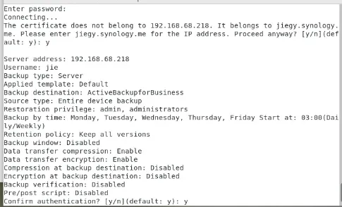 3.5 若连接成功则提示确认连接,确认后输入 Y 并回车,后提示检查备份模板,确认无误后输入 Y 并回车。