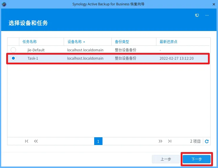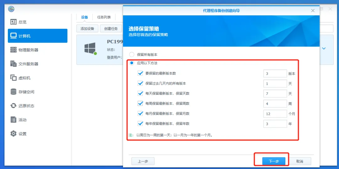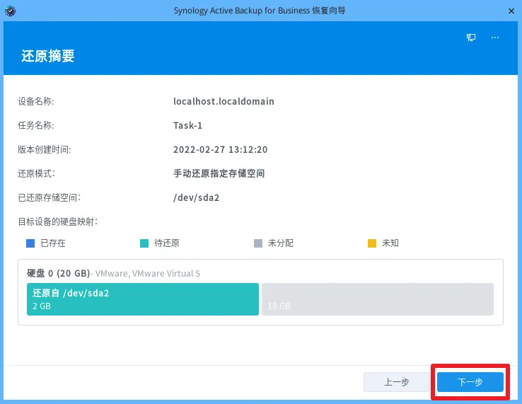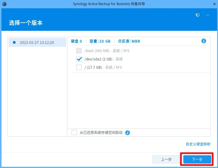 10.选择还原版本,若您在上一步已选择手动还原指定存储空间,那么您还需选择要还原的空间。设置完成后,单击下一步。