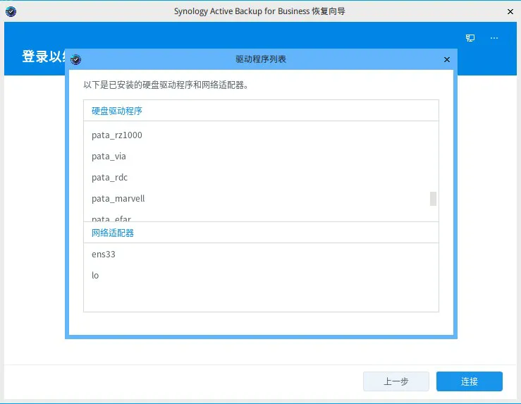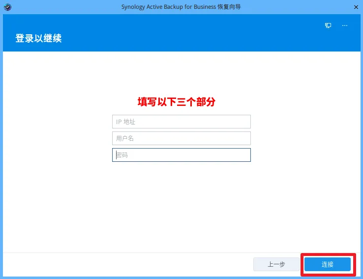 6.输入 IP 地址、执行备份任务或有还原权限的 NAS 帐号密码,点击连接。