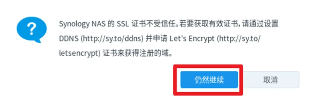 7.若 SSL 设置不正确,则会提示证书不受信任,请单击仍然继续。
