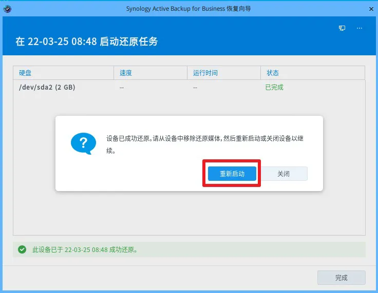 13.等待还原完成后,单击完成,移除还原媒体,并单击重新启动。