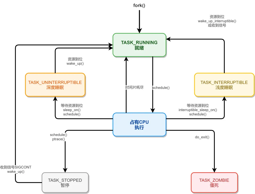 Linux的进程在几个状态间进行切换如下图所示。