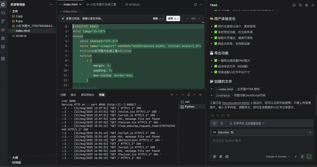每天 AI 消息推送到我们面前时,我们在思考,AI 工具如何为我所用?让一些想法变成现实。平时生活中使用小红书,来查找生活攻略,每次打开小红书,都被里面的美图吸睛了,我们能不能也做一个这样的美图呢?樱木第一时间想到了 Trae 这款编程工具,毕竟现在这款工具,是樱木用的最顺手的一个,我们来看看。官方网站:https://www.trae.cn/首先,我们整理出,小红书图文生成工具大体的功能如下:1、用户上传背景图