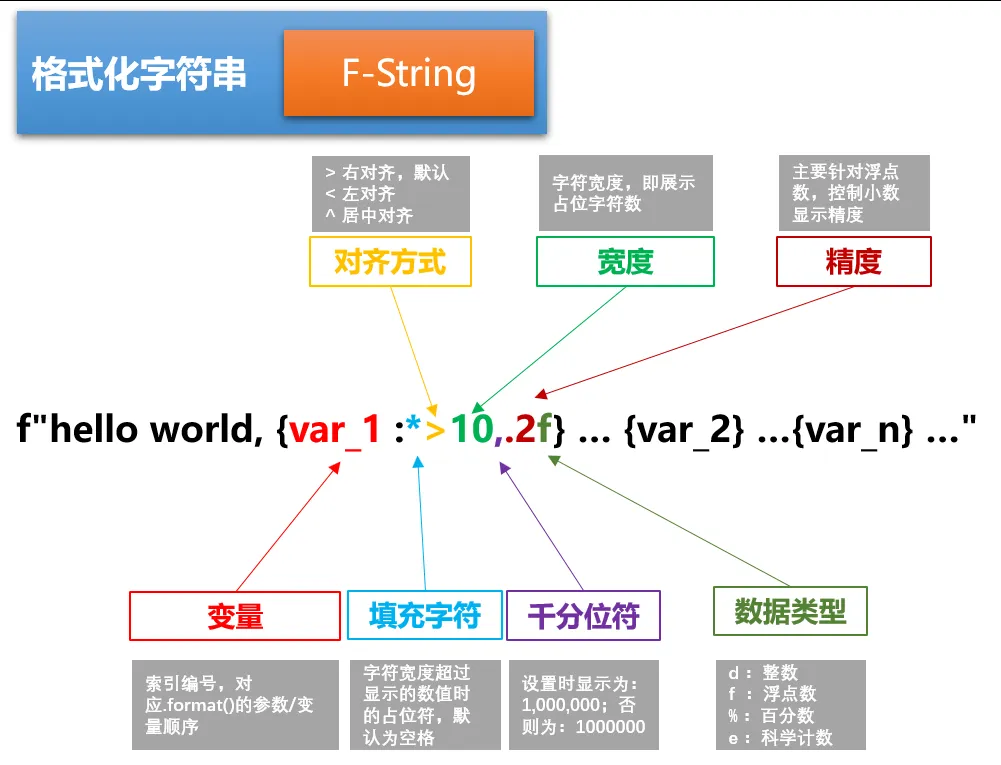 f-string是一种format()字符串的升级版本,通过将变量指标放入花括号的冒号前面,直接绑定变量的位置,避免了format在变量过多情况下的混乱。开发中,推荐使用f字符串,更简洁明了。格式如下: