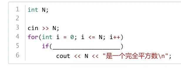 如果⼀个整数N能够表⽰为X*X 的形式,那么它就是⼀个完全平⽅数,下⾯C++代码⽤于完成判断N是否为⼀个完全平⽅数,在横线处应填⼊的代码是( )。