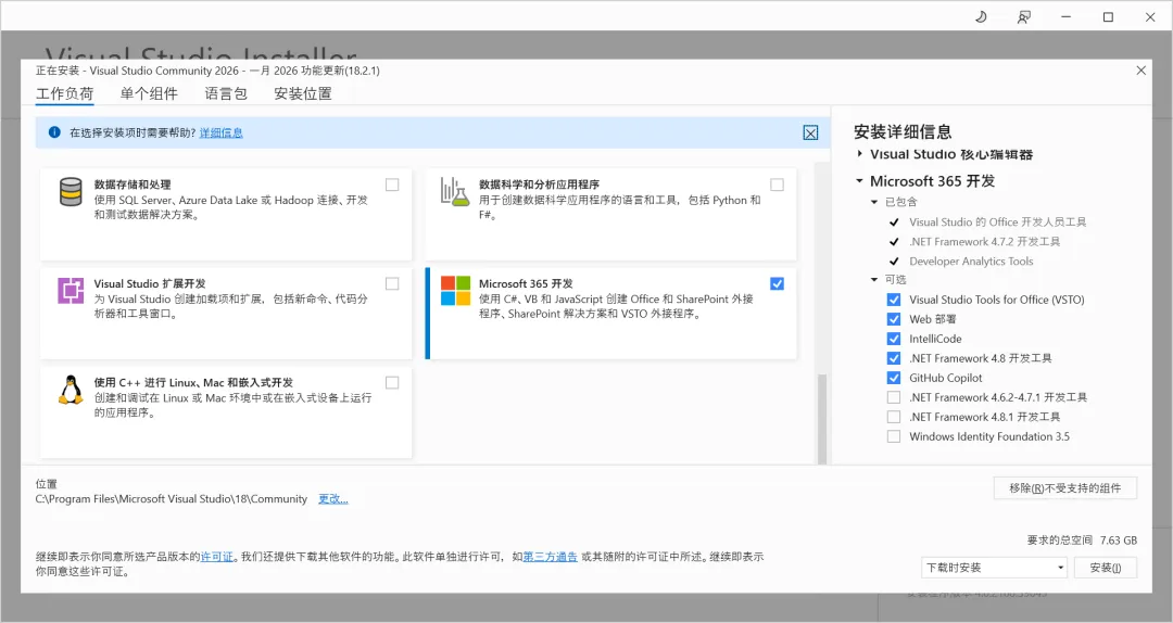 1、点击VisualStudioSetup.exe,可用中选择需要的版本,等待进入配置界面,勾选【Microsoft 365 开发】,其他选项默认即可,点击【安装】